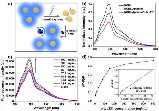 p-tau231 is considered as a promising biomarker of the emerging AD pathology because p-tau231 is neuropathologically increased earlier than p-tau181, not only prior to the positive threshold of amyloid beta, but in response to early brain tau deposition [,,]. Therefore, monitoring the presence of plasma p-tau231 could be essential for the early diagnosis of AD. We developed the fluorescent aptasensor for p-tau231 using the aptamer of p-tau231, which was identified by Teng’s group []. Figure S5 of the SI shows the secondary structure of p-tau231 aptamer that was predicted using the web server for RNA secondary structure prediction (https://rna.urmc.rochester.edu/RNAstructureWeb, accessed on 8 March 2021). Figure 3a shows the principle of the turn-on fluorescent aptasensor for p-tau231 detection. The p-tau231 aptamer used in the aptasensor is a single-stranded oligonucleotide that possesses abundant negative charges along the structure of the aptamer due to the presence of phosphate backbone [,]. Upon the addition of p-tau231 aptamer into NCDs solution, positively charged NCDs could absorb onto the aptamer through electrostatic interaction, leading to the fluorescence quenching effect due to fluorescence resonance energy transfer. Owing to the high affinity and specificity of the aptamer to the target, once p-tau231 is introduced into the complex NCDs/aptamer solution along with Mg2+ ions, Mg2+ ions (final concentration of 1 mM) could accelerate the saturated folding transition of aptamers into the specific shape that selectively bind to their targets [,], leading to the release of NCDs that could recover the fluorescence intensity. The proof of principle is supported by the fluorescence performance of this aptasensor, as shown in Figure 3b. The fluorescence emission intensity of the NCDs solution under 365 nm UV irradiation sharply reduced after the addition of aptamer, confirming the quenching effect of aptamer towards the NCDs. However, the fluorescence recovery was observed after the introduction of p-tau231 biomarker through the significant increase in fluorescence intensity. These results confirm the potential of this aptasensor for the detection of p-tau231 in early AD diagnosis.
