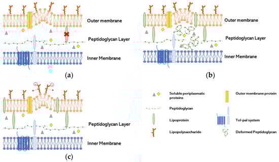 - LPP links deficiency (Figure 1a): the presence of LPP in the unbound form has been found in OMV, indicating that the covalent links were broken, or their distribution was not homogenous, since the conversion of free-form LPP into bound form is reversible []. These characteristics seems to be induced by the non-proportional growth of the OM compared with the PG layer []. The relation of the lack of link between OmpA and PG has been proven to be essential to the production of OMV in Salmonella spp. [].