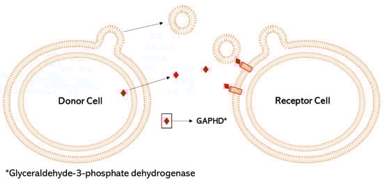 Attachment of some vesicles can be explained by the charges of Mg2+ and Ca2+ at the bacterial membrane. These ions can form salt-bridges between the vesicles and the membrane of exposed cells, that are rich in those ions []. Increasing the composition and concentration of ions in the medium reduces the repulsive electrostatic force, allowing particle aggregation. A recent study demonstrated that acidic pH enhances the merging of OMV-OMV from E. coli []. More recently, a fusogenic enzyme, glyceraldehyde-3-phosphate dehydrogenase (GAPDH), has been discovered alongside OMV from M. xanthus and it seems to modulate the fusion with E. coli cells (Figure 2) [].