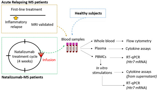 This study was carried out in accordance with the protocol validated by the Ethics Committee EST IV from Strasbourg in France. Trial registration at clinicaltrials.gov is NCT04546698. All written informed consent forms followed the ethical guidelines that the 1964 Declaration of Helsinki had set. MS patients were diagnosed according to the 2018 revised McDonald criteria [13] and were recruited from the neurology unit of the “Centre Hospitalier Régional d’Orléans”. Healthy subjects were recruited from the “Établissement Français du Sang” (Orléans, France). Starting with blood samples, the study design is summarized in Figure 1. Samples from MS patients with acute relapse were obtained during an inflammatory phase before any treatment to limit relapse. Natalizumab-treated MS patients were cured for at least 6 months, and blood samples were obtained at the end of one cycle of natalizumab (4-week cycle) and before the next infusion. They were clinically stable with normal MRI scans and a minimum of 6 months of treatment. The following demographic and clinical characteristics were evaluated in every case: age, sex, disease duration, MS group (ARMS: acute relapsing MS, NTZ: natalizumab-treated MS), disability scores (EDSS: Expanded Disability Status Scale), and treatment with selective serotonin recapture inhibitors. Healthy controls were matched for age and sex, as displayed in Table 1.