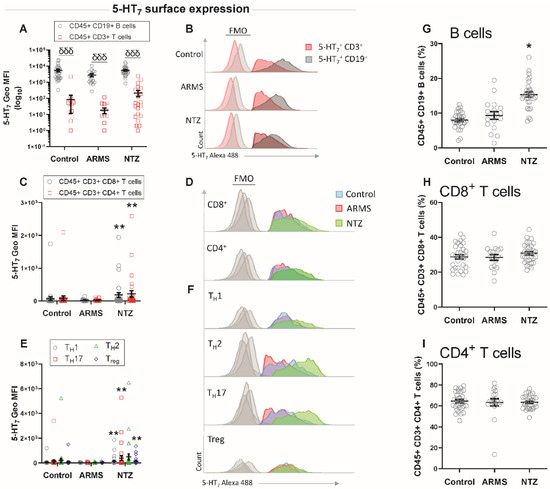 5-HT7 expression level on the surface of circulating lymphocytes from control, ARMS, and NTZ patients. Geometric mean fluorescence intensity (Geo MFI) of 5-HT7 surface expression and histogram representation of the cytometry analysis on CD45+ CD19+ B and CD45+ CD3+ T lymphocytes (A,B), on CD3+ CD8+ and CD3+ CD4+ T cells (C,D), and CD4+ T cell subsets (E,F). Proportions of circulating cells analyzed by flow cytometry are shown for B cells (G), CD8+ (H), and CD4+ T cells (I) from control, ARMS, and NTZ patients. Results are given as mean ± SEM. B cells compared with T cells for each group. *: compare with control. δδδ p < 0.001; * p < 0.05; ** p < 0.01.