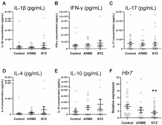 Plasma immunological context and Htr7 gene expression in PBMCs from control, ARMS, and NTZ patients. Cytokines assays: IL-1β (A), IFN-γ (B), IL-17 (C), IL-4 (D), and IL-10 (E) from plasma samples of control, ARMS, and NTZ patients. Htr7 was analyzed by RT-qPCR. The relative expression of Htr7 mRNA levels, normalized to Gapdh and Hprt1 of control subjects, is shown (F). Results are given as mean ± SEM. ** p < 0.01 compared with control.