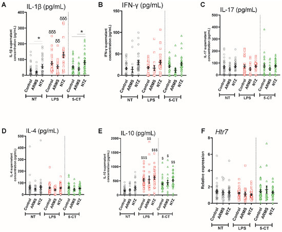 Effects of 5-HT7 receptor agonist 5-CT on PBMC cytokine releases compared to LPS stimulation. Cytokines assays: IL-1β (A), IFN-γ (B), IL-17 (C), IL-4 (D), and IL-10 (E) were performed from PBMC supernatants of control, ARMS, and NTZ patients. Htr7 was analyzed by RT-qPCR. The relative expression of Htr7 mRNA levels, normalized to Gapdh and Hprt1 of non-treated PBMCs from the control, is shown (F). Results are given as mean ± SEM. *: compare the values under the bars. $: compare with the respective non-treated (NT) condition. Compare with both NT and 5-CT conditions. * p < 0.05; $ p < 0.05; $$ p < 0.01; $$$ p < 0.001; δδ p < 0.01; δδδ p < 0.001.