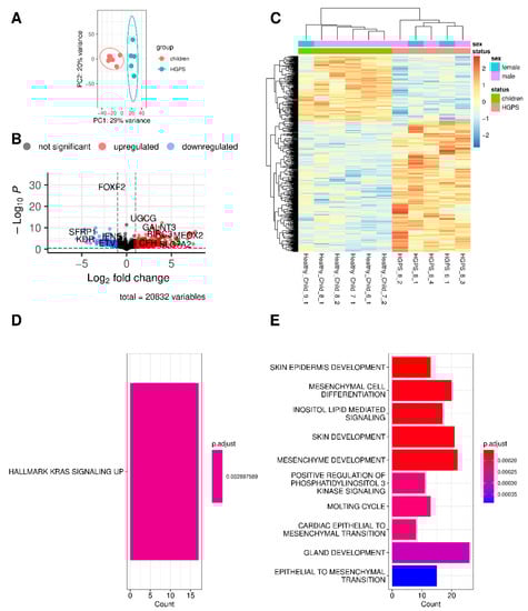 Comparing gene expression in RNA sequencing data of HGPS patients and healthy children (progeria/accelerated aging). (A) Principal Component Analysis (PCA): HGPS patients (blue dots) compared to healthy children (controls, red dots). (B) Volcano plot visualizing differentially expressed genes (DEGs): significantly upregulated genes are shown as red dots, significantly downregulated genes as blue dots, gray dots symbolize genes without significant changes in gene expression. (C) Heatmap and hierarchical clustering of the DEGs. (D) Bar plot of enriched hallmark pathways. (E) Bar plot of GO enriched biological processes.