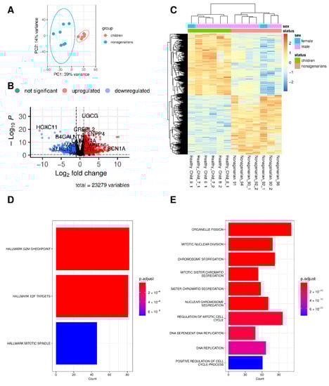 Principal Component Analysis (PCA, Figure 1A and Figure 2A) indicates differences in gene expression between HGPS patients and healthy children (progeria, premature or accelerated aging) and nonagenarians and healthy children (aging), respectively. DEGs are visualized as volcano plot [] (Figure 1B and Figure 2B) and as heatmap [] with hierarchical clustering (Figure 1C and Figure 2C). Upregulation is visualized in red, downregulation in blue. Comparing HGPS patients and healthy children (HGPS vs. healthy children, Figure 1) resulted in 497 DEGs, with 332 genes being upregulated and 165 downregulated in progeria. In natural aging (90s vs. healthy children, Figure 2), 2743 genes are differentially expressed, with 1350 DEGs being upregulated and 1393 being downregulated (Supplementary Materials, Tables S2, S5, and S6).