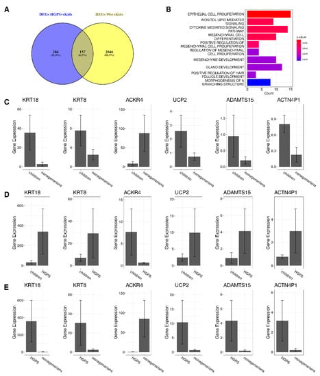 Comparing the changes in gene expression (log2foldchanges) of the 157 DEGs revealed that six DEGs (KRT18 (Keratin 18), KRT8 (Keratin 8), ACKR4 (atypical chemokine receptor 4), UCP2 (Uncoupling Protein 2), ADAMTS15 (ADAM metallopeptidase with thrombospondin type 1 motif 15), and ACTN4P1 (Actinin alpha 4 pseudogene 1)) were regulated in opposite directions. For instance, while HGPS patients express more KRT18 than healthy children (Figure 3D), the expression of KRT18 appears to be reduced upon normal aging as nonagenarians express less KRT18 than both healthy children (Figure 3C) and children affected with HGPS (Figure 3E).