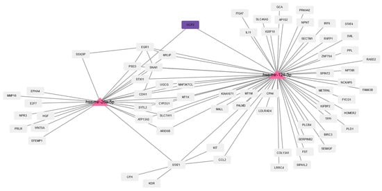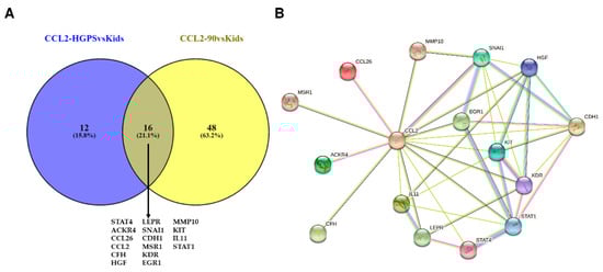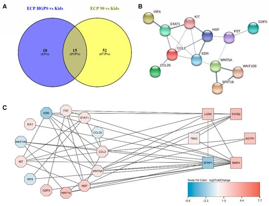 Comparing the DEGs in HGPS that are involved in ECP with the DEGs in old age and ECP shows that both groups have 15 genes of the ECP pathway in common: WNT16 (Wnt Family Member 16), CCL26 (C-C Motif Chemokine Ligand 26), HGF (Hepatocyte Growth Factor), PTPRN (Protein Tyrosine Phosphatase Receptor Type N), CCL2 (C-C Motif Chemokine Ligand 2), WNT5A (Wnt Family Member 5A), STAT1 (Signal Transducer And Activator Of Transcription 1), IRF6 (Interferon Regulatory Factor 6), GDF5 (Growth Differentiation Factor 5), SIX1 (SIX Homeobox 1/Sine Oculis Homeobox Homolog 1), KDR (Kinase Insert Domain Receptor), FST (Follistatin), KIT (KIT Proto-Oncogene, Receptor Tyrosine Kinase), NKX3-1 (NK3 Homeobox 1), and WNT10B (Wnt Family Member 10B) (Figure 4A). Analyzing these genes in the STRING database [] (Figure 4B) shows that almost all of these DEGs are linked with each other.