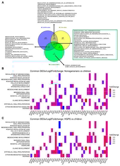 Differences in gene expression between HGPS and aging. (A) Venn diagram visualizing the GO BPs enriched in HGPS (blue), aging (yellow), and in the 157 common DEGs of progeria and aging. 15 BPs are enriched in all three analyses. (B) Heat plot visualizing the changes in gene expression in the DEGs involved in the 15 BPs using the changes in gene expression observed while comparing nonagenarians and healthy children (log2foldchanges of DESeq2 analysis). (C) Heat plot visualizing the changes in gene expression in the DEGs involved in the 15 BPs using the changes in gene expression observed while comparing progeria patients and healthy children (log2foldchanges of DESeq2 analysis). The differences in gene expression are indicated by color (red for upregulated, blue for downregulated). Notably, UCP2, which is involved in gland development, is upregulated in progeria but downregulated in aging. ACKR4, which is involved in the cytokine-mediated signaling pathway, is upregulated in aging (comparison of healthy children and nonagenarians) but downregulated in progeria (comparison of healthy children and progeria patients).