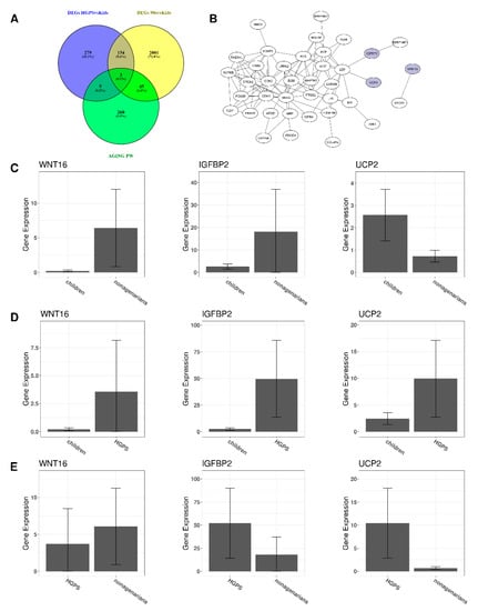 Network visualization of miRNAs related to WNT16, IGFBP2, and UCP2. (A) Comparing the genes involved in the Aging Pathway (green) with the DEGs in progeria comparison (blue) and the aging comparison (yellow) results in three common DEGs WNT16, IGFBP2, and UCP2. (B) Network visualization of the DEGs involved in the aging pathway and differentially expressed between healthy children and nonagenarians. The three DEGs that are also differentially expressed when comparing progeria patients and nonagenarians are highlighted in purple. (C) Gene expression of the three DEGs WNT16, IGFBP2, and UCP2, when comparing children and nonagenarians. (D) Gene expression of the three DEGs WNT16, IGFBP2, and UCP2, when comparing children and HGPS phasents. (E) Gene expression of the three DEGs WNT16, IGFBP2, and UCP2, when comparing progeria patients and nonagenarians.