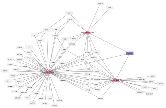 MicroRNAs (miRNAs, miRs) are small non-coding RNAs that are photogenically conserved and act as master regulators of gene expression []. miRNAs were predicted using the web platform miRNet 2.0 (https://www.mirnet.ca/, version 2.0, accessed on 22 July 2022) []. For our analysis, we used the genes that were differentially expressed in the respective analyses. The predicted miRNAs for all three analyses (progeria DEGs, aging DEGs, and the 157 common DEGs) and the subsequent analyses are available in the Supplementary Materials (Table S4). Here, we focus on the miRNA prediction using the 157 common DEGs, resulting in 37 predicted miRNAs.