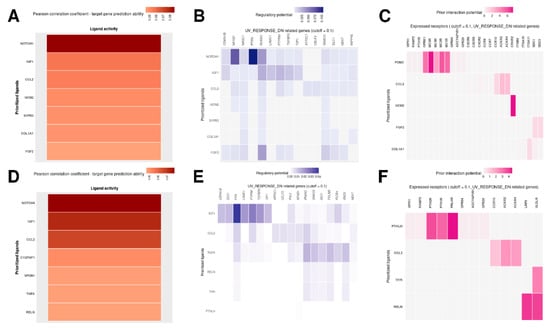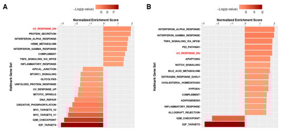 Gene Set Enrichment Analysis (GSEA) [] is integrated into the NicheNet workflow. Figure 10A,B visualizes the pathways in aging and HGPS, respectively. The pathway UV response (processes resulting in changes in a cell or organism upon ultraviolet radiation/UV light) has the highest positive normalized enrichment score (NES) in aging and is also among the top five positive enriched pathways in progeria. Here, we focus on UV response, as it has been shown that sun exposure induces the expression of progerin in human skin []. Additionally, accumulation of progerin has been associated with vascular disease in progeria [], but, over time, it also accumulates in non-HGPS individuals []. It might thus contribute to vascular aging and vascular disease [].