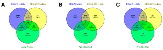 The aging pathway was among the enriched pathways in aging but not in progeria. As we were especially interested in aging, we compared the DEGs of HGPS and aging with the genes known to be involved in the biological process “GOBP_AGING” (Figure 6A), which can be found in the Molecular Signatures Database (MSigDB) []. The DEGs between healthy children and nonagenarians also related to the aging pathway are shown in Figure 6B. The three DEGs that appear to be associated with the aging pathway, progeria and normal aging are highlighted in purple.