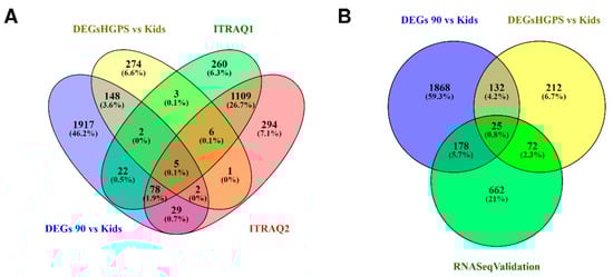 Venn diagrams were introduced almost 150 years ago as a method of visually representing classes and elements contained in one or several of these classes using intersecting circles []. Venn Diagrams can represent results that are rather difficult to explain in words in an intuitively understandable graphic representation. Therefore, they can be used to visualize overlapping genes between several groups. Besides that, Venn diagram tools, like the web app Venny [] (https://bioinfogp.cnb.csic.es/tools/venny/, accessed on 22 July 2022), also offer to extract lists of every section of the Venn diagram [].