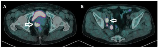 Several PET radiotracers are available for PCa imaging. The first radiopharmaceutical employed for staging and restaging PCa was choline, radiolabeled with 11C or 18F [12]. Choline is a component of phosphatidylcholine, one of the main constituents of cell membranes [13]. Several studies have shown upregulation of choline kinase in malignant transformation of cancer cells, particularly PCa [14]. To date, besides staging indications described above, choline PET is utilized for detecting recurrent PCa in the case of PSA elevation during follow-up [15]. More recently, new radiopharmaceutical agents both for staging and restaging PCa were introduced, such as radiolabeled ligands of prostate-specific membrane antigen (PSMA) [16,17]. [68Ga]Ga-PSMA-11, the most utilized, allows the detection of lesions expressing PSMA, which is directly related to the GS and to the aggressive behavior of PCa [18]. Thus, PSMA imaging in PCa contributes to distinguishing low-risk from high-risk cancers [18].