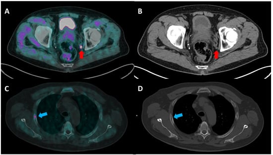 (A,B) A 71-year-old man with locally advanced PCa (Gleason score 9, 4 + 5 and a serum PSA value of 36 ng/mL) underwent [18F]F-choline PET/CT ((A) transaxial fused image; (B) CT image) for the initial staging of the disease. The PET/CT image shows a pathological uptake corresponding to a small left internal iliac lymph node (red arrow). Lymph node metastasis was not detected in CT staging, as its size (0.7 × 0.6 mm) was below the significance criteria. (C,D) A 68 year-old-man with PCa (G.S 6, 3 + 3; PSA value of 71.29 ng/mL) was imaged with [18F]F-choline PET/CT staging ((C) transaxial fused image; (D) CT image), with evidence of a focal uptake corresponding to a bone lesion at the third right rib (blue arrow), which could not be detected by CT due to the normal bone structure.