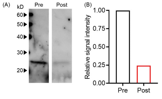 Plasma exchange-reduced EVs. (A) T-EV levels pre- and post-plasma exchange were analyzed by Western blot with anti-human CD9 antibody. (B) The signal intensity of Western blot bands in (A) was normalized with pre-plasma exchange.