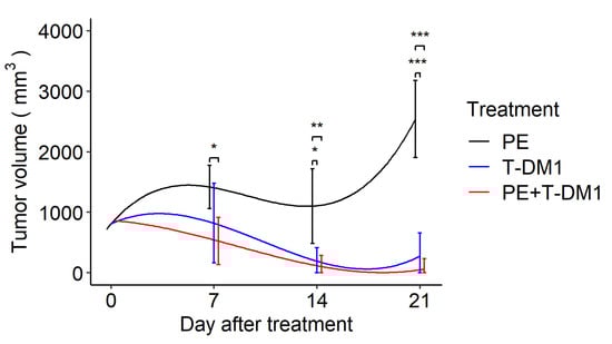 A drug/filtration combination increases the removal of EVs and enhances tumor shrinkage by T-DM1. Longitudinal marginal means of the tumor volume after the tumor size reached approximately 10 mm in diameter with treatment by plasma exchange, T-DM1, and plasma exchange with T-DM1 (n = 12 in each group) based on the linear mixed model. PE: plasma exchange, T-DM1: trastuzumab emtansine. Error bars indicate confidence intervals; * p < 0.05, ** p < 0.01, *** p < 0.001.