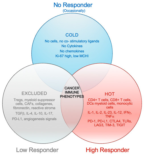 Evaluating data from preclinical and translational research, Chen and Mellman [15] suggested clustering tumors into three major immune phenotypes: the inflamed phenotype (“hot”), the immune-excluded phenotype (“excluded”), and the immune-desert phenotype (“cold”).