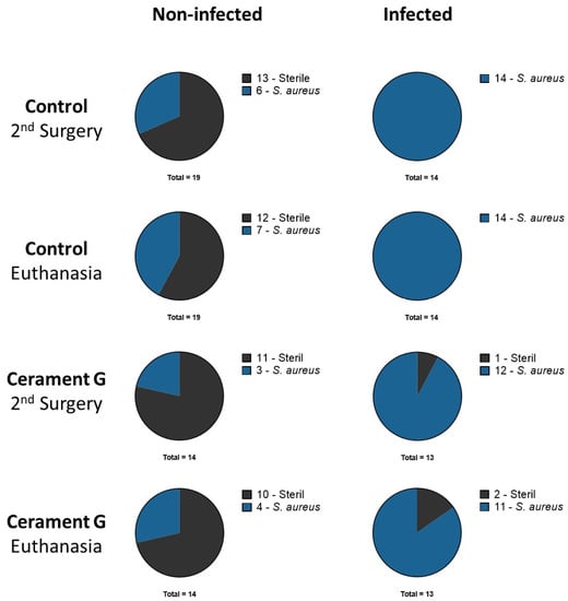 In the NI control group, an increasing colonization and secondary infection rate in the microbiological specimens was delectable between the second surgery and euthanasia. This observation could also be made in an attenuated form in the NI Cerament group. All bacteria detected in the non-infected groups had a different spa-typing than the inoculated strain.