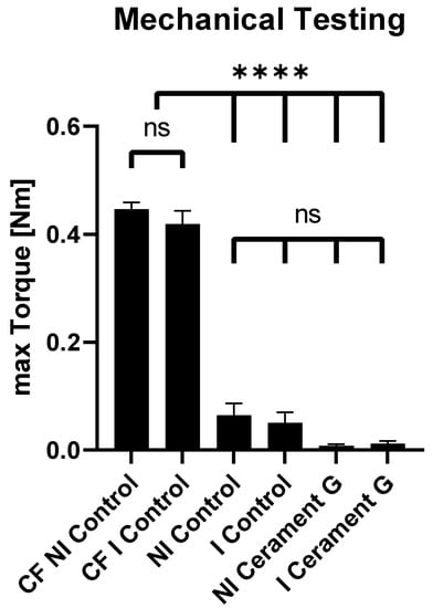 Mechanical testing. Max. torque of the non-infected and infected contralateral femora (CF NI Control + CF I Control) is significantly higher than the max. torque of all of the other groups. No significant differences between all of the other groups were detected. **** = p < 0.0001, ns = not significant.