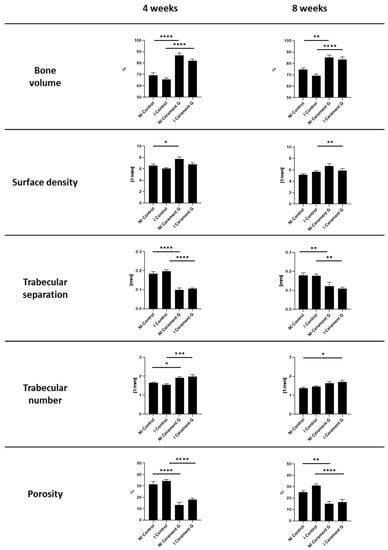 µCT Analysis of the bone 4 and 8 weeks after the second Surgery. **** = p < 0.0001, *** = p < 0.001, ** = p < 0.01, * = p < 0.05, ns = not significant.