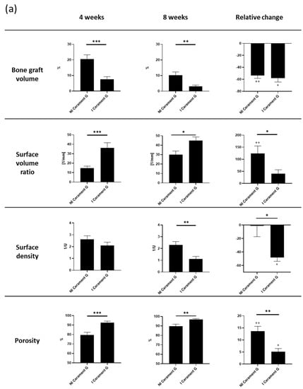 (a) µ-cT analysis of the bone graft four and eight weeks after the second surgery. Relative change describes the difference from the fourth to the eighth week. The relative change is measured within and between the groups. *** = p < 0.001, ** = p < 0.01, * = p < 0.05, ++ = p < 0.01 comparison of 4 to 8 weeks, + = p < 0.05 comparison of 4 to 8 weeks, ns = not significant. (b) The µ-CT images postmortem visualize the degradation of the bone graft substitute and the transformation of the surrounding bone in the infected groups. (c) Density of the bone graft Cerament G (BMD). The I Cerament G group shows significant less density than the NI Cerament group. *** = p < 0.001.