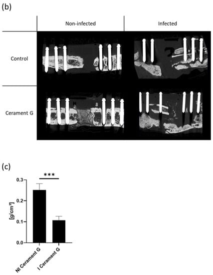 Cerament G density measurements (bone mineral density—BMD) showed a significant decrease in infected samples (Figure 4c). However, this was a further indication that the infection was responsible for the destruction of the bone substitute.