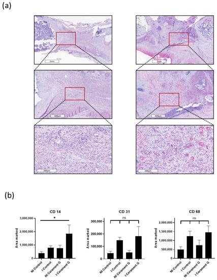 To analyze the systemic inflammatory response, CD14 and CD68 stainings were prepared. Immunohistochemical staining of CD68 was the highest in the infected groups and thus analogous to the hypervascularization (Figure 5b). The CD14 marker was significantly increased in the I Cerament group compared with the NI Control group (Figure 5a). However, no differences could be detected between the I Control group and the NI Cerament group (Figure 5b).