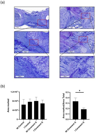 Toluidine staining shows significantly more invasion of toluidine positive osteoblasts in the defect of NI Cerament G compared to I Cerament G group. (a) + (b). * = p < 0.05.
