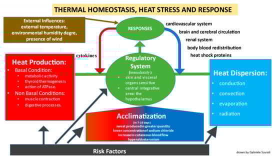 When the body is under heat stress, thermal homeostasis is maintained through the regulated balance (immediately for the regulatory system and after 7–10 days through the acclimatization process) among the factors that produce heat (red square) and heat dissipation (blue square). However, modifiable and non-modifiable risk factors can compromise both the regulation and acclimatization systems and the factors capable of producing or dispersing heat.