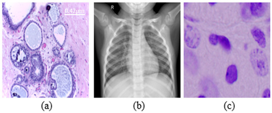 Examples from datasets were used. (a) Histopathology (scale bar—0.42 μm), (b) chest X-rays, (c) nuclei cells.