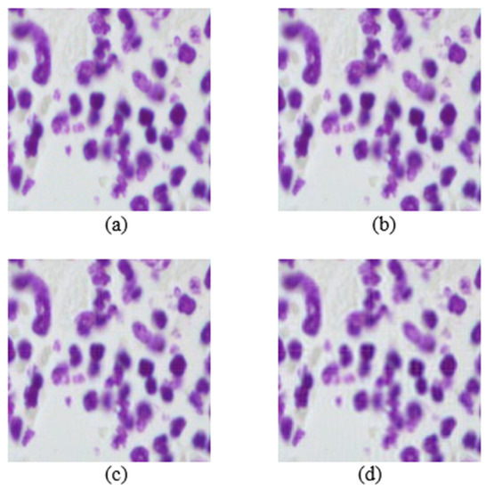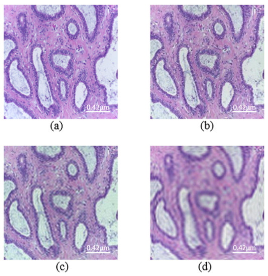 Images from the histopathological dataset (scale bar—0.42 μm). (a) Original image. Mb-Ada with order, (b) 200, (c) 120, (d) 50.