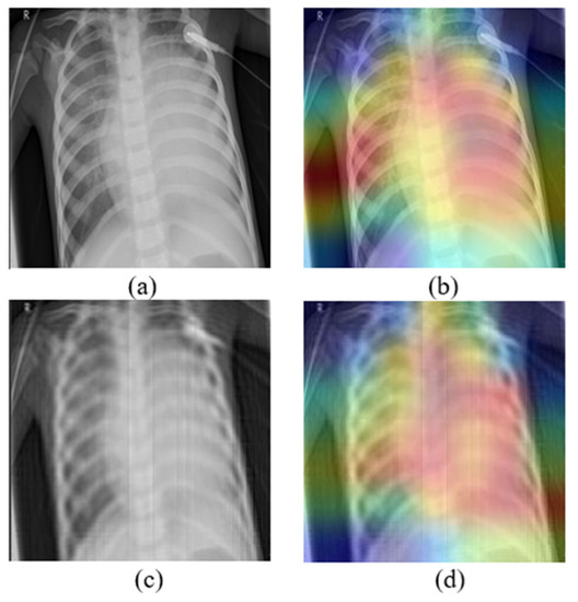 (a) Original image, (b) the corresponding GradCAM, (c) image under Mb-AdA with order 60, and (d) the corresponding GradCAM.