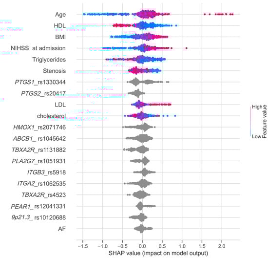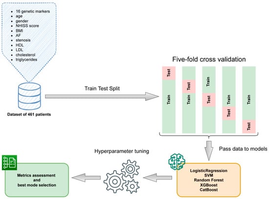 To build a predictive machine learning model, several approaches have been tested using the following Python 3.8 libraries: sklearn.linear_model.LogisticRegression, sklearn.svm.SVC, sklearn.ensemble.RandomForestClassifier [], XGBoost [] and CatBoost []. All models were trained in a five-fold cross validation (CV) setting with folds stratified to keep the proportion of studies similar to the whole data set. Each model parameter was optimized in order to increase the classification metrics: accuracy, AUC and F1-score, paying the most attention to the latter metric. The array of features consisted of all 16 genetic markers along with the age, gender, NHISS score at admission, body mass index (BMI), atrial fibrillation (AF), stenosis, high-density lipoproteins (HDLs), low-density lipoproteins (LDLs), cholesterol and triglycerides. Feature importance ranking was obtained using Shapley additive explanations (SHAP) values, a game theoretic approach to explain the output of any machine learning model []. The sequence of the ML procedure pipeline is shown in Figure 1.