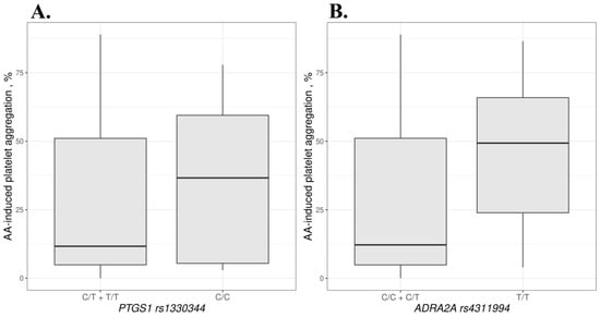 We compared the association of different genotypes with AA- and ADP-induced aggregation. For PTGS1 rs1330344, mean AA-induced aggregation was 40.5% higher in the CC genotype compared to the TT + CT genotypes (p = 0.038). For rs4311994 in the ADRA2A gene, mean AA-induced aggregation was 72.7% higher in patients with the TT genotype compared to the CC + CT genotypes (p = 0.043). Data are shown in Figure 2 and in Supplementary Table S4.