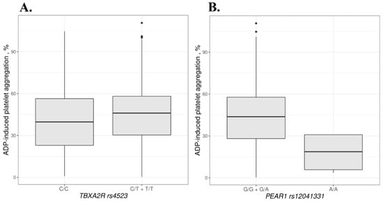 ADP-induced aggregation based on the TBXA2R rs4523 (A) and PEAR1 rs12041331 (B) genotypes. Dots beyond the whiskers indicate the outliers.