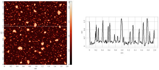 Typical AFM image (left) of objects adsorbed on mica substrate after its incubation in 0.1 µM HRP solution in 2 mM PBSD buffer at room temperature (T = 25 °C). (Right) panel displays cross-sectional profile corresponding to the line in the AFM image. For the AFM image, scan size is 2 µm × 2 µm, and Z scale is 2 nm.