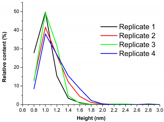 Figure 3 displays the results of processing the data obtained in four technical replicates of the experiment, presented in the form of plots of the relative distributions of the AFM-visualized objects with height.