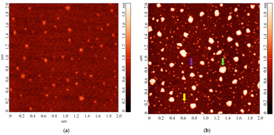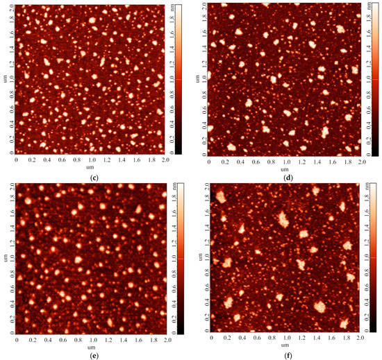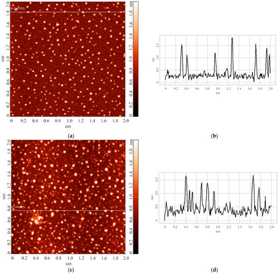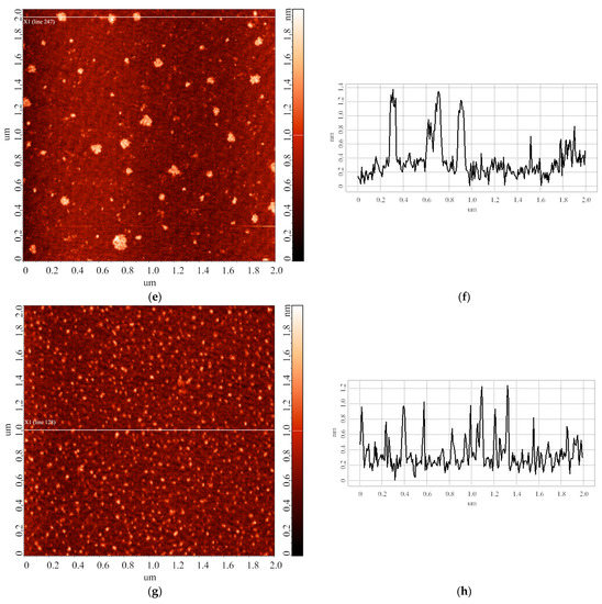 The images shown in Figure 6 indicate that the heights of the AFM-imaged objects make up to 2 nm. At that, both laterally compact (Figure 6c,g) and laterally extended (Figure 6c,e) are present on the substrate surface. It should be noted that a different adsorption efficiency is observed: namely, the number of objects visualized in the case of the solution stored for 28 days significantly exceeds that for the 14-day storage duration. Table 2 summarizes the results of processing the AFM data obtained in this experimental series: the relative contents of objects attributed to either “group 1” (α1; h ≤ 1.4 nm) or “group 2” (α2; h > 1.4 nm) are listed.