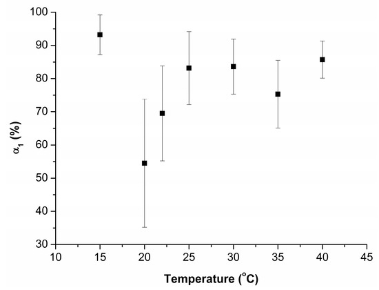 The data presented in Figure 5 indicate that in all cases, mean values of α1 are equal to each other within the error. The values of α1 (20 °C) and α1 (22 °C) are, however, somewhat lower than those obtained at other temperatures. For these temperature points, the number of technical replicates is increased from three to six. The error for the respective mean values of α1, however, remains higher than those obtained under other experimental conditions.