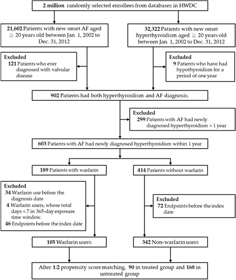 We defined patients with hyperthyroidism-related nonvalvular AF who received warfarin within 365 days after the first nonvalvular AF diagnosis as the exposed group. The index date was defined as the first date on which warfarin was prescribed. A total prescription length of 7 days or longer was applied. We excluded patients who had previously used anticoagulants. All enrolled patients were followed up from the index date until the occurrence of any study outcome independently, or until the end date of the study (31 December 2016), whichever came first.