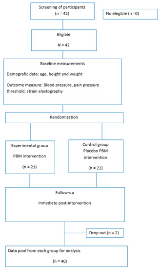 A total of 42 participants were recruited, but 2 participants were excluded due to not completing the proposed assessments. A final number of 40 participants were accepted and completed the baseline assessment, as shown in the flow diagram.