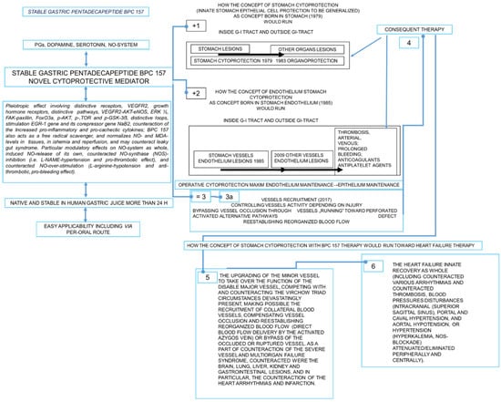 Description of the BPC 157 therapy. Cytoprotection concept (for review, see [,,,,,,,,,,,,,,]) born in the stomach appears with cytoprotective agents application as innate stomach epithelial cell protection (indicated as +1) to be generalized (Robert, Szabo) in other organs epithelia protection (organoprotection) supplemented by stomach endothelium cell protection (indicated as +2) (Szabo). Together (+1, +2), these result in cytoprotection stomach maxim endothelial maintenance→epithelial maintenance (indicated as = 3) as axis for the rapid defensive response to resolve the ongoing lesions, which is, however, not fully operative with the standard cytoprotective agents. As novel cytoprotection mediator, BPC 157 might exert prominent epithelial beneficial effects in the stomach and in the whole gastrointestinal tract and in the other organs (stomach cytoprotection→organoprotection) (+1) and endothelial beneficial effect in the stomach (+2). Therefore, BPC 157 therapy might make the stomach maxim endothelial maintenance→epithelial maintenance (indicated as =3) a fully operative axis (indicated as 3a). Further, BPC 157 therapy might extend the original cytoprotection maxim endothelial maintenance→epithelial maintenance from the stomach to the other vessels endothelium protection (3a) [,,,,,,,,,,]. In this, BPC 157 might induce particular vessel recruitment and activation depending on injury, i.e., when confronted with vessel occlusion, there was collateral activation to bypass vessel occlusion, as well as when confronted with perforated defect, vessel “running“ toward the defect (3a) [,,,,,,,,,,]. The rapid result is the re-establishing of the reorganized blood flow (3a). As consequence, there was a particular therapy that might beneficially affect thrombosis, arterial and venous, and lesions presentation (indicated as 4). For the BPC 157 therapy of the heart failure, BPC 157 therapy might induce particular upgrading of the minor vessel to take over function of the disabled major vessel, resolving Virchow triad circumstances devastatingly present, making possible collateral vessels activation, compensating function of the major vessel, reestablishing reorganized blood flow (direct blood flow by the activated azygos vein) (indicated as 5) [,,,,,,,,,,]. In confrontation with the severe syndrome (i.e., heart failure, in particular), the successful activation of the compensatory collateral circulation was ascribed to the counteraction of the vascular and multiorgan failure, counteraction of the intracranial (superior sagittal sinus), portal and caval hypertension and aortal hypotension (5) [,,,,,,,,,,]. The final result of the BPC 157 therapy (indicated as 6) might be the heart failure innate recovery as a whole (including counteracted various arrhythmias and counteracted thrombosis, blood pressures disturbances (intracranial (superior sagittal sinus), portal and caval hypertension, and aortal hypotension [,,,,,,,,,], or hypertension (hyperkalemia, NOS-blockade) [,] attenuated/eliminated peripherally and centrally). Moreover, as part of the general beneficial pleiotropic effect (as part of the cytoprotection background) [,,,,,,], there was the counteraction of the concomitant severe vessel and multiorgan failure syndrome [,,,,,,,,], the counteraction of the brain, lung, liver, kidney and gastrointestinal severe lesions, almost annihilated thrombosis, counteraction of the escalated general peripheral and central syndrome. In addition, BPC 157 also acts as a free radical scavenger, counteracts free radical-induced lesions, and normalizes NO and MDA levels in tissues and during ischemia and reperfusion [,,,,,,,,,,,,,,,,,], and thereby, due to its particular cytoprotective/cardioprotective activity [,,,,,,], it might beneficially affect the myocardial lesions, in particular [,,,,,,,,,,]. Finally, in addition to the clear demonstration of the therapeutic efficacy in the most adequate animal models as proof of the concept, the additional evidence involves particular interaction with many molecular pathways [,,,,,,,,,,,,,,,,]. Pleiotropic effects involving distinctive receptors, including VEGFR2 and growth hormone receptors, distinctive pathways, including VEGFR2-AKT-eNOS, ERK ½, FAK-paxillin, FoxO3a, p-AKT, p-mTOR and p-GSK-3β, and distinctive loops, including stimulation of the egr-1 gene and its corepressor gene naB2, and counteraction of increases in pro-inflammatory and procachectic cytokines, and counteraction of the leaky gut syndrome [,,,,,,,,,,,,,,,,], likely minimize the inherent lack of full understanding of the mechanisms that may be involved. In the interaction with many molecular pathways [,,,,,,,,,,,,,,,,], particular consideration should be given to the evidence of the BPC 157/ NO-system’s particular importance (i.e., the endothelium and thrombocytes function both maintained (for review, see, i.e., [,,,,,,])). BPC 157 therapy counteracted thrombocytopenia in rats that underwent major vessel occlusion and deep vein thrombosis [] and counteracted thrombosis in all vascular studies [,,,,,,,,,,,]), and coagulation pathways not affected [,,]. Further arguments might be controlling vasomotor tone and the activation of the Src-Caveolin-1-eNOS pathway [,]. This likely occurred as the particular modulatory effects on NO-system as a whole, induced NO-release of its own [,,], counteracted NOS-inhibition [] (i.e., N(G)-nitro-L-arginine methylester (L-NAME)-hypertension and pro-thrombotic effect) [,], and counteracted NO-over-stimulation [] (L-arginine-hypotension and anti-thrombotic, pro-bleeding effect) [,]. Likewise, the isoprenaline-myocardial infarction was counteracted as NO-effect []. Thus, due to its close interaction with NO-system as NO acts as an endogenous cardioprotectant antifibrillatory factor [,] and BPC 157 might have a particular therapeutic effect.