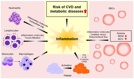 The incidence of CVD and metabolic diseases, including T2DM, is increasing worldwide; it is crucial to diagnose, predict, and prevent these conditions as early as possible [80]. This review suggests that CBC can be an important and valuable marker in patients with CVD and other metabolic diseases. Furthermore, we organized the pathophysiology that can explain the relationship between CBC components and diseases (Figure 1). Clinicians frequently encounter patients with CVD and metabolic diseases in clinical practice. However, the most optimal tests for each condition are not available to all patients, and clinicians who have limited facilities cannot conduct all preferred tests. The most straightforward and informative test that can be conducted clinically is CBC. Chronic inflammation contributes to the development and exacerbation of CVD and other metabolic diseases. In addition, tissue or cell damage caused by changes in hemodynamics contributes to disease progression. CBC offers a variety of information by reflecting the pathogenesis of these diseases. WBC count and NLR, in particular, can reflect systemic inflammation, while RDW and MCV can provide information on inflammation and overall hemodynamic state. Platelets can reflect vascular damage and systemic inflammation and provide disease severity and gender differences. These markers can be obtained directly from CBC results or can be obtained through simple calculations. Furthermore, CBCs are cost-effective, and they are routinely performed in most clinical settings [2]. Interestingly, Anderson et al. reported the usefulness of a CBC-derived risk score in predicting mortality risk in patients with suspected CVD using WBC count, platelet count, hematocrit, Hb, RDW, MCV, and MCHC [81]. The authors proposed the prediction models of various diseases using CBC components. In conclusion, the use of CBC components including WBC, NLR, RDW, and MCV could improve the sensitivity and specificity of detecting and predicting CVD and metabolic diseases as early as possible.