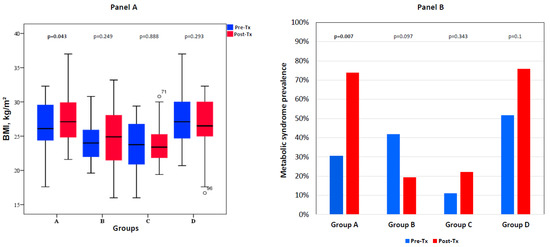 Changes in body mass index (BMI) [Panel A] and in metabolic syndrome prevalence [Panel B] from pre-transplant to post-transplant assessment in patients grouped according to changes in glucose metabolic state. Group A: worsened, including PTDM (N = 23); group B: improved (N = 31); group C: persistently normal glucose metabolism (N = 36); group D: unchanged pre-diabetes/DM (N = 29).