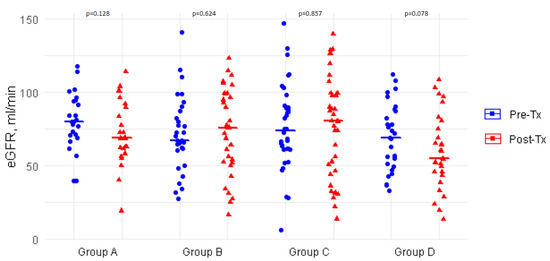 Column scatter plot showing changes in the estimated glomerular filtration rate from pre-transplant to post-transplant assessment in patients grouped according to changes in glucose metabolic state. Group A: worsened, including PTDM (N = 23); group B: improved (N = 31); group C: persistently normal glucose metabolism (N = 36); group D: unchanged pre-diabetes/DM (N = 29).