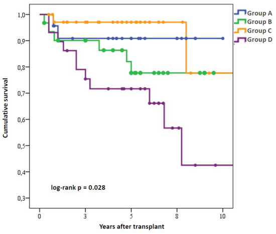 Mortality was significantly different according to post-transplant glucose metabolic changes. In particular, early mortality was lower in group C patients (stably normal), whereas improvement of glucose metabolic state after transplant (group B) favorably affected mid-term mortality, which was indeed better than in group D where glucose metabolism remained altered (log-rank p = 0.028; Figure 3). Survival in the overall study sample (all subgroups) was also analysed in a logistic regression model in relation to all major clinical risk factors before and after transplant, as well as all variables related to glucose metabolism (Supplementary Table S2). As shown, none of the evaluated factors was an independent predictor of mortality in the multivariable analysis.