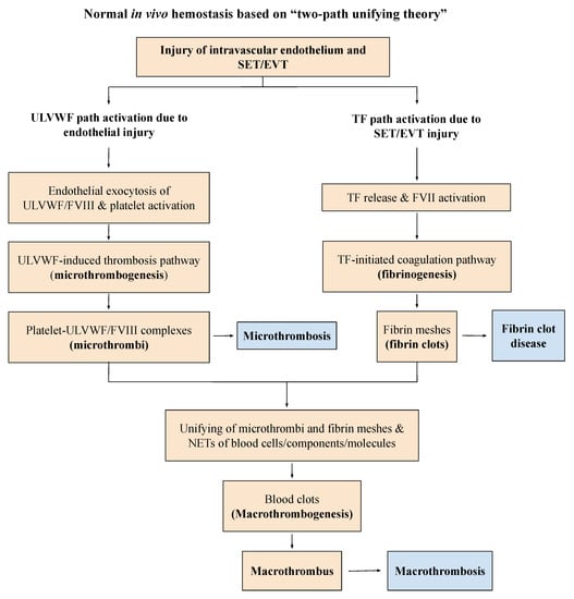 The second principle is “Hemostasis must be activated through ULVWF path and/or TF path”, which differentiate microthrombosis (i.e., endotheliopathy) due to activated ULVWF path in vascular wall damage limited to ECs from macrothrombosis (e.g., deep venous thrombosis) due to activated ULVWF path and activated TF path in vascular damage extending from EC to SET/EVT. Microthrombosis is the result of microthrombogenesis, and macrothrombosis is the result of macrothrombogenesis as depicted in Figure 1. This notion supports that activated ULVWF path in extensive endotheliopathy produces microthrombi strings composed of platelet-ULVWF/FVIII complexes, but activated TF path with minimum release of ULVWF in localized intravascular trauma produces macrothrombus made of platelet-ULVWF/FVIII complexes and fibrin-thrombin clots. This principle supports (1) vascular injury is the initiating point of hemostasis, (2) every thrombosis except a few conditions—which will be discussed later—should be the result of vascular injury, and (3) bleeding or thrombosis does not occur without a vascular injury, even in hemophilia and thrombophilia [].