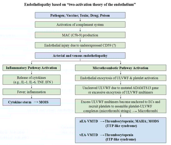 Endotheliopathy is a very colorful pathologic disorder with well-established molecular pathogenesis (Figure 2), creating the complex phenotypes of the microthrombotic disorder as well as inflammation and autoimmune phenomenon []. Finally, with novel classification of thrombotic disorders, the diagnosis of endotheliopathy can be readily recognized by endothelial molecular markers and laboratory tests, which includes activated complement components, increased cytokines, markedly increased FVIII activity and overexpressed ULVWF/VWF antigen, and consumptive thrombocytopenia [,]. Among these markers, inflammatory markers (i.e., cytokines) activate inflammatory pathway provoking inflammation and multiorgan inflammatory syndrome (MOIS) [,,], and microthrombotic markers (i.e., overexpressed ULVWF/FVIII and platelets) trigger microthrombotic pathway promoting microthrombogenesis [,,,,] orchestrationg EA-VMTD and MODS, and both pathways also contribute to autoimmune pathway [,,,,] promoting to autoimmunity and autoimmune diseases.
