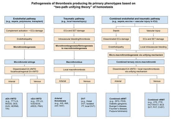 The most common thrombosis encountering among many human diseases is microthrombosis (i.e., VMTD), which can be induced by sepsis (e.g., bacterial, viral, fungal, rickettsial and parasitic), polytrauma, envenomation, side effects of drugs, diabetes, autoimmune disease, and complications of surgery, pregnancy and transplant. EA-VMTD is usually disseminated in the microvasculature [,,,,,,,]. It is well established to be due to complement activated endotheliopathy leading to ECs dysfunction [,]. In the past and still now, the diagnosis of EA-VMTD has been masked or wrongly termed as disseminated coagulopathy (e.g., DIC) [,]. In addition to the concept of EA-VMTD, aEA-VMTD and vEA-VMTD arising from two vascular milieux are now recognized as two different phenotypic entities of microthrombosis after the experience learned from COVID-19 pandemic [,,].